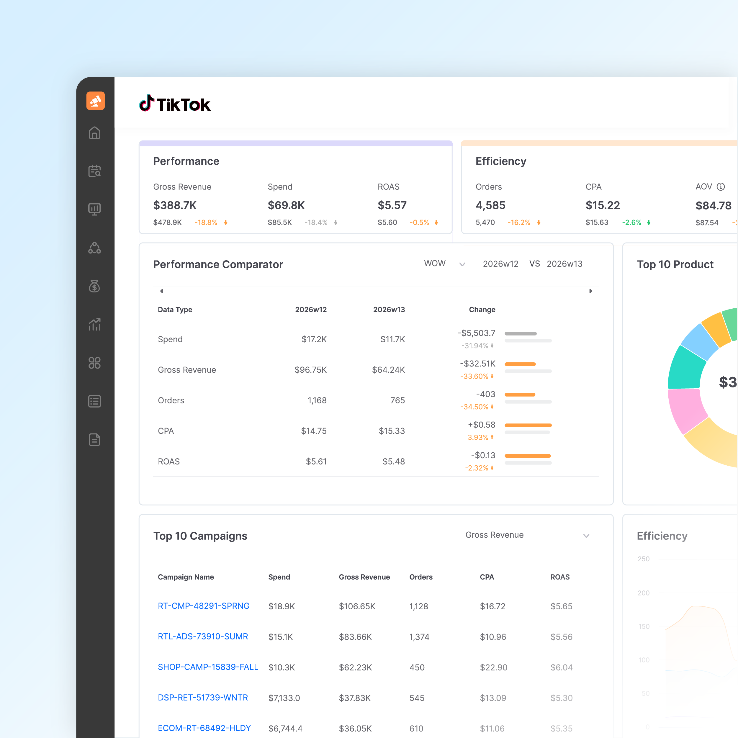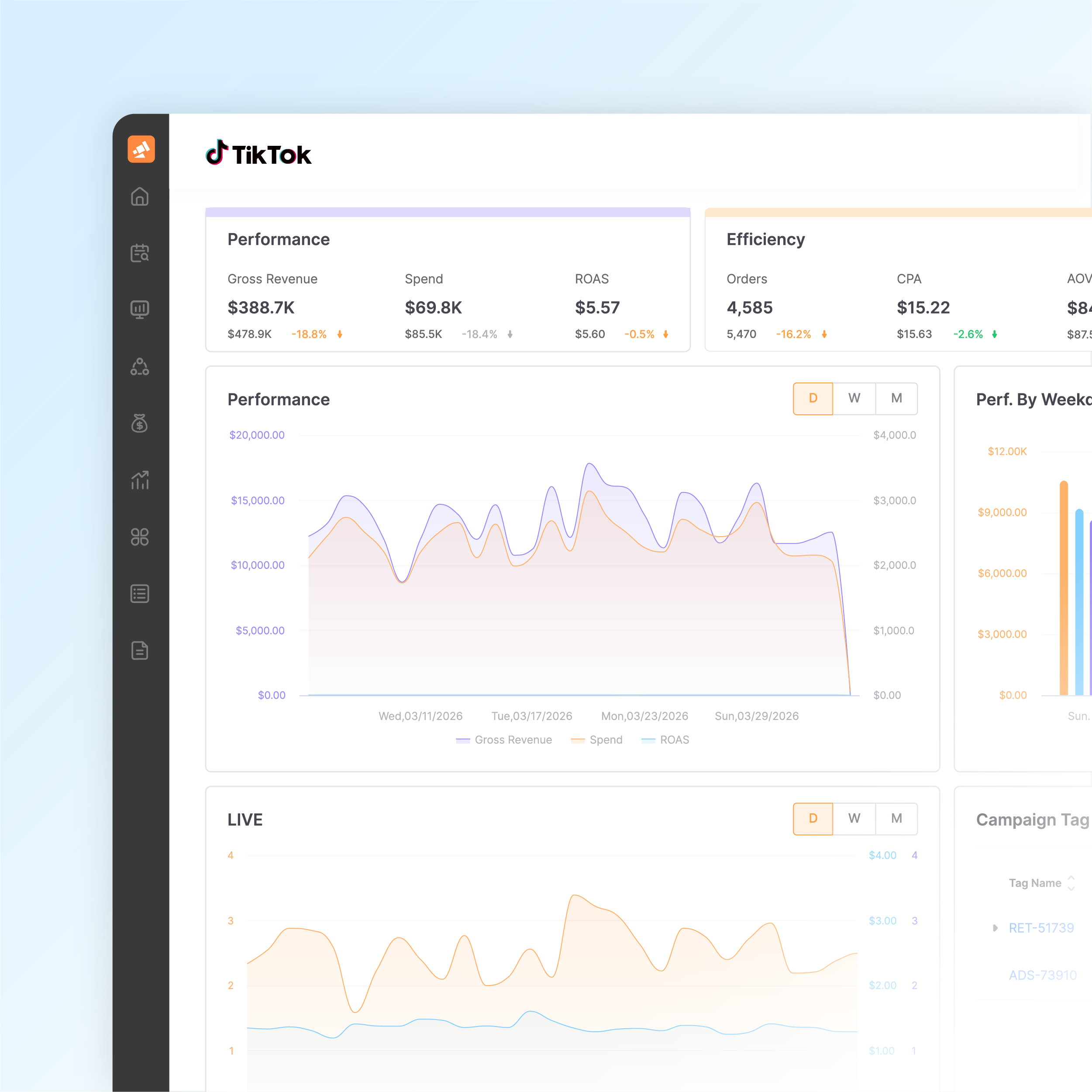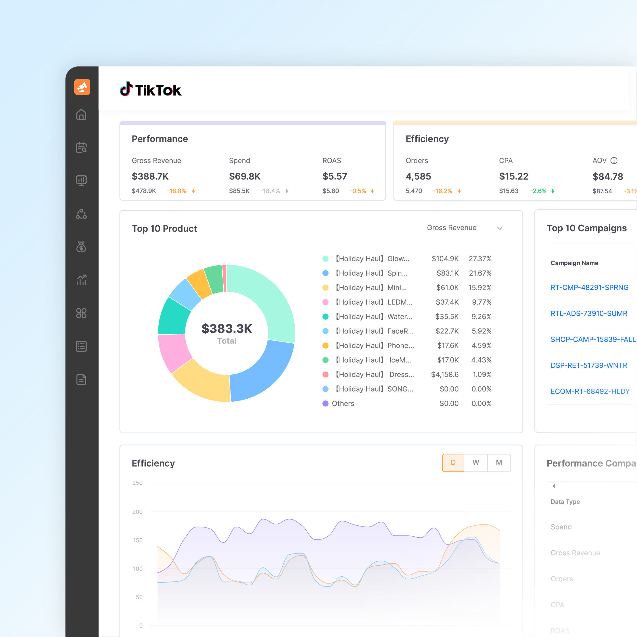 Verbinden Sie TikTok-Anzeigen und E-Commerce-Daten auf einer einzigen Plattform, um zu messen, wie TikTok den Umsatz bei Einzelhändlern steigert – und nicht nur den Bruttowarenumsatz (GMV).